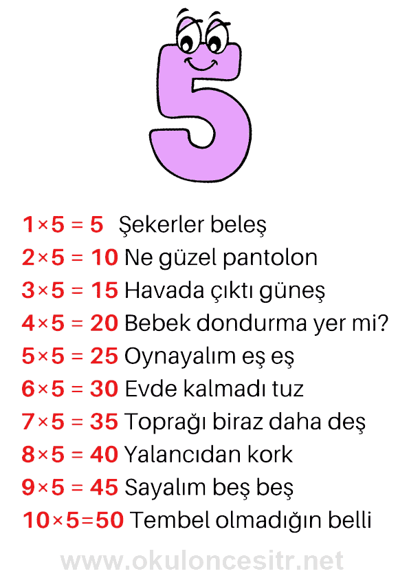 5 Rakamı çarpım tablosuna ve çıktı almak için 9 rakamı çarpım tablosu resmine ulaşabilirsiniz.