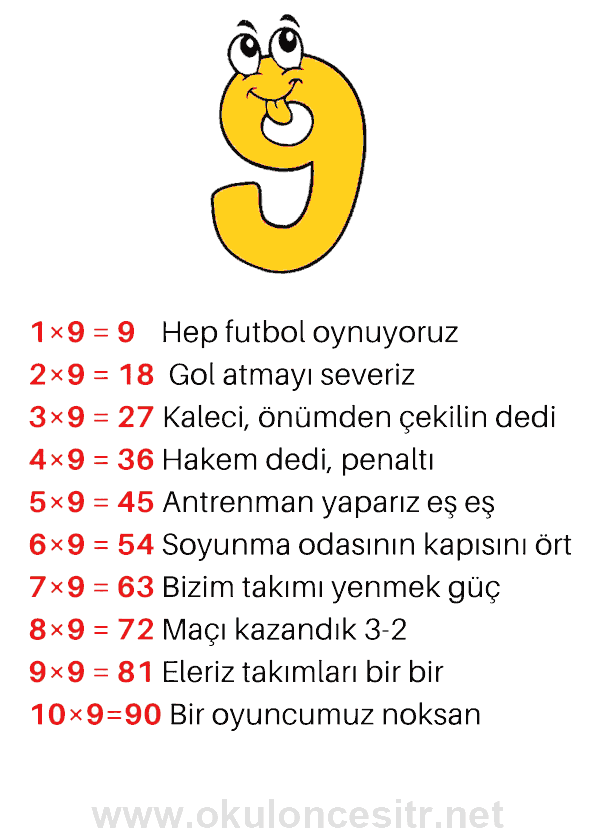 9 Rakamı çarpım tablosuna ve çıktı almak için 9 rakamı çarpım tablosu resmine ulaşabilirsiniz.