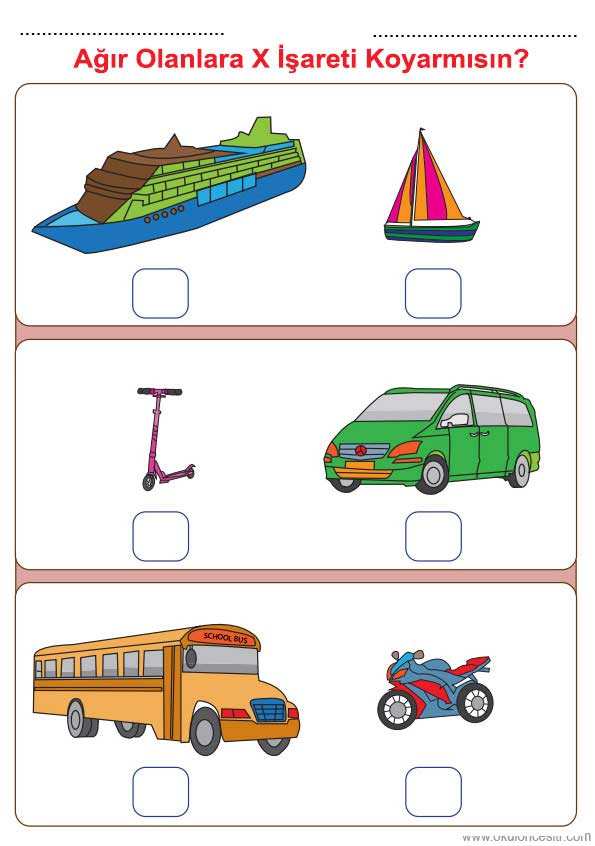 Ağır hafif kavramı çalışma sayfası ve otobüs, gemi ağır hafif miktar kavramı çalışmaları etkinliği, oyunu örnekleri kağıdı indirme ve çıktı yazdırma. Free heavy and light worksheets download printable.