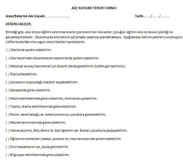 Ailelerin eğitimde katkılarını belirtmek için gerekli olan yeni Aile Katılımı Tercih Formu ekte sunulmuş olup, aşağıdaki butondan indirebilirsiniz.