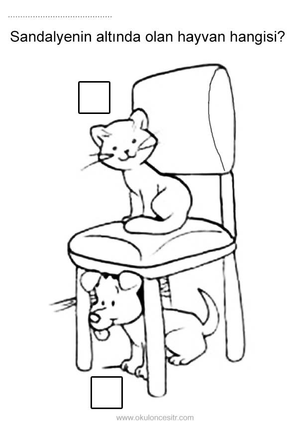 Altında üstünde kavramı çalışma sayfası etkinlikleri ile sandalye altında üstünde kedi mekanda konum kavramları çalışmaları etkinliği örnekleri kağıdı indirme, çıktı yazdırma. Free under and above worksheets download printable.