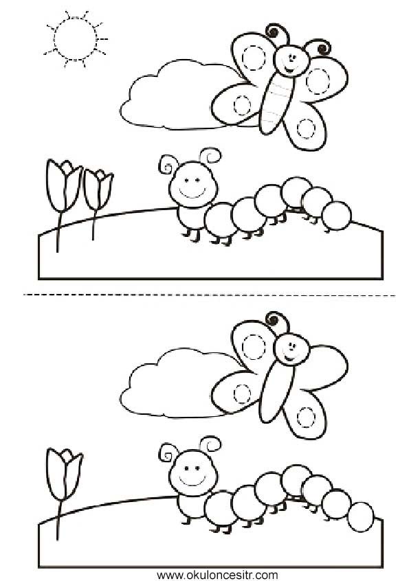 Kelebek tırtıl iki resim arasındaki 7 farkı bulmaca sayfaları kağıdı ve aradaki farkı bul çalışma kağıtları bilgisayarınıza indirip yazıcıdan yazdırın, çıktı alın. Free find the difference worksheets printables.