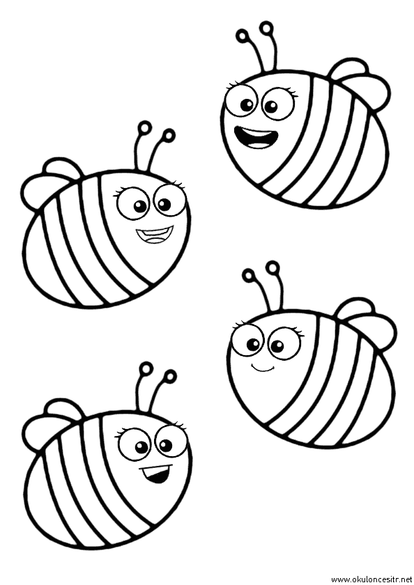 Arı boyama sayfası ve dört tane arı boyaması resmi, böcek arı boyamaları sayfaları kalıbı çizimi, okul öncesi anasınıfı arı etkinlikleri kağıdı, örnekleri nasıl resimleri çizilir, ücretsiz indir yazdır çıkartabilirsiniz. Preschool free bee coloring page download and printable for kindergarten kids.