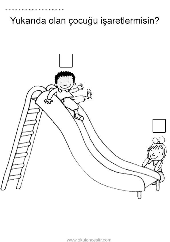 Aşağıda yukarıda kavramı çalışma sayfası etkinlikleri ve kaydırak aşağıda yukarıda mekanda konum kavramları çalışmaları etkinliği örnekleri kağıdı indirme, çıktı yazdırma. Free above and below worksheets download printable.