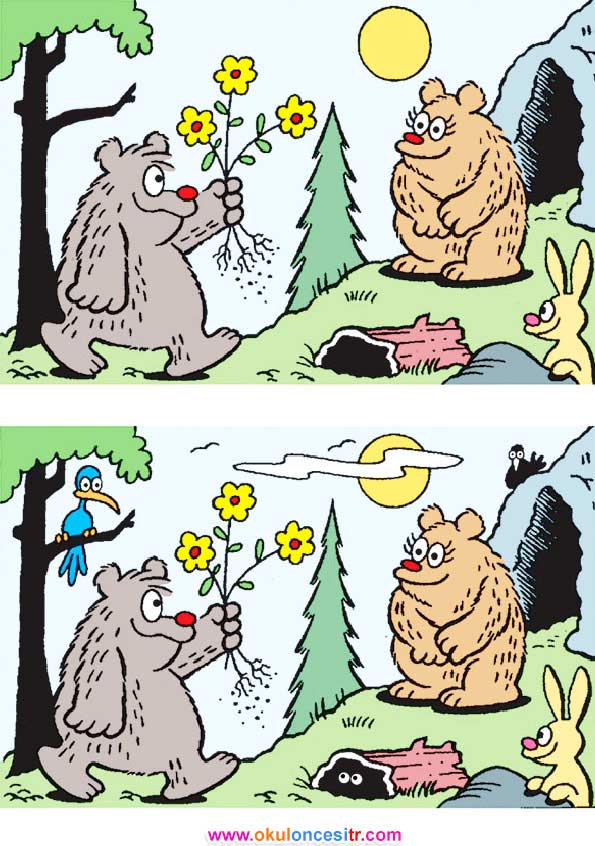 Romantik ayı iki resim arasındaki 7 farkı bulmaca sayfaları kağıdı ve aradaki farkı bul çalışma kağıtları bilgisayarınıza indirip yazıcıdan yazdırın, çıktı alın. Free find the difference worksheets printables.