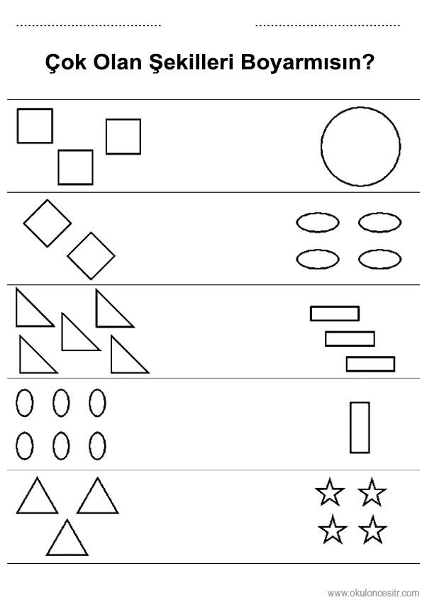 Az çok kavramı çalışma sayfası ve geometrik şekiller kare, üçgen, yuvarlak, yıldız az çok miktar kavramı çalışmaları oyunu, etkinliği örnekleri kağıdı indirme ve çıktı yazdırma. Free more or less worksheets download printable.