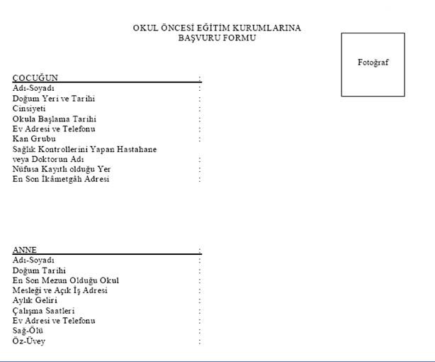 Ailelerin çocuklarını Okul Öncesine kayıt ettirmek için başvuru da kullanacakları Başvuru Formu ekte sunulmuş olup, aşağıdaki butondan indirebilirsiniz.