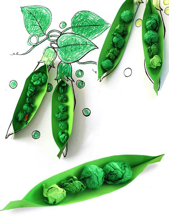 Kağıt işleri olarak basit bir şekilde bezelye kalıbıyla birlikte kolay üç boyutlu bezelye yapımı etkinliği örneği çalışmaları.
