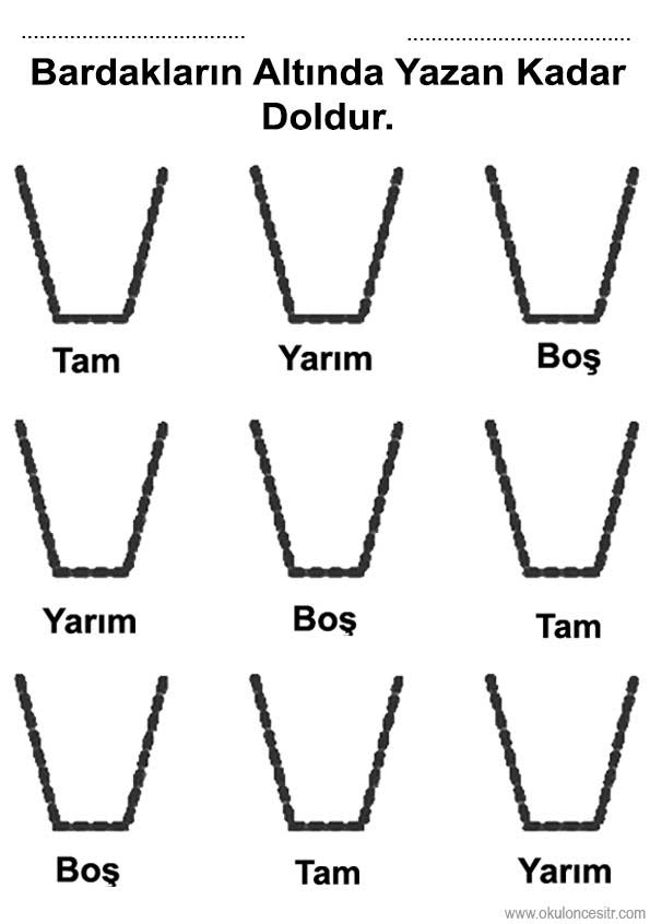 Boş dolu kavramı çalışma sayfası ve boş dolu bardak miktar kavramı çalışmaları etkinliği, oyunu örnekleri kağıdı indirme ve çıktı yazdırma. Free empty and full worksheets download printable.