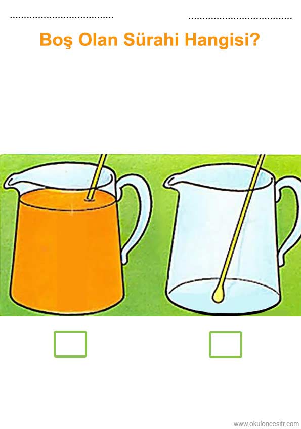 Boş dolu kavramı çalışma sayfası ve boş dolu sürahi miktar kavramları çalışmaları etkinliği, oyunu örnekleri kağıdı indirme ve çıktı yazdırma. Free empty and full worksheets download printable.