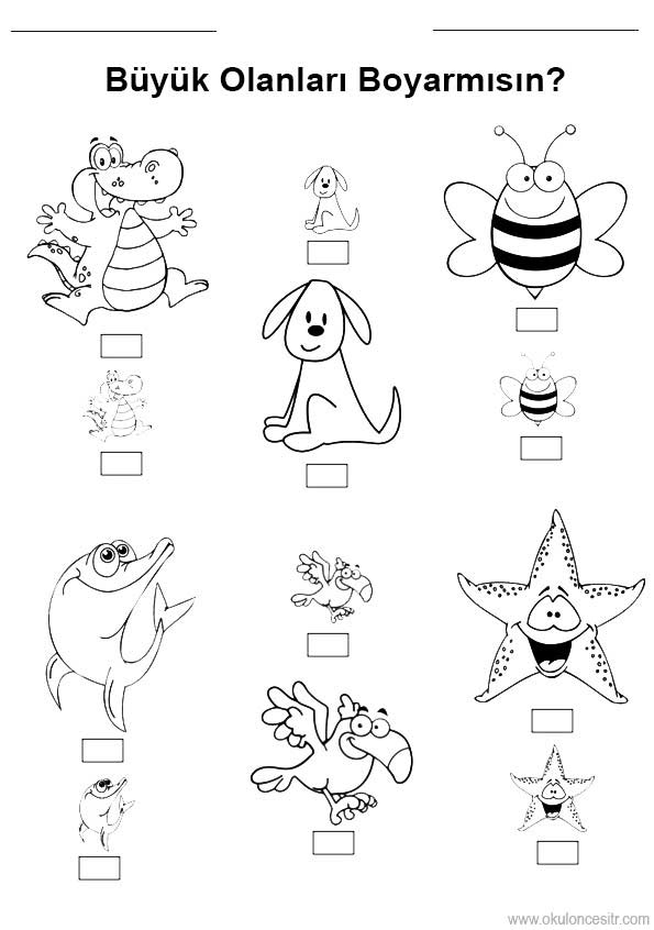 Büyük küçük kavramı çalışmaları sayfası etkinlikleri ve hayvanlar dinazor, yunus balığı büyük küçük boyut kavramları oyunu örnekleri kağıdı indirme ve çıktı al yazdırma. Free big and small worksheets download printable.