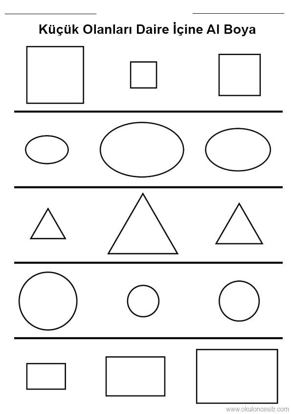 Büyük küçük kavramı çalışmaları sayfası etkinlikleri ve geometrik şekiller, yuvarlak, üçgen, kare büyük küçük boyut kavramları oyunu örnekleri kağıdı indirme ve çıktı al yazdırma. Free big and small worksheets download printable.