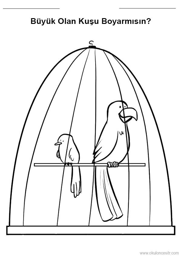 Büyük küçük kavramı çalışmaları sayfası etkinlikleri ve kafeste kuş, papağan büyük küçük boyut kavramları oyunu örnekleri kağıdı indirme ve çıktı al yazdırma. Free big and small worksheets download printable.