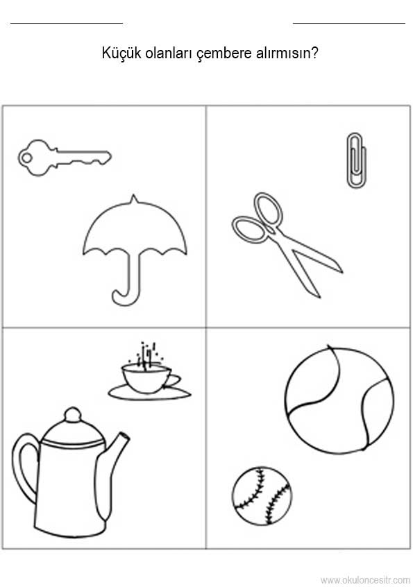 Büyük küçük kavramı çalışmaları sayfası etkinlikleri ve makas, çaydanlık büyük küçük boyut kavramları oyunu örnekleri kağıdı indirme ve çıktı al yazdırma. Free big and small worksheets download printable.
