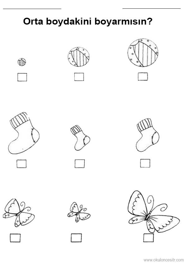 Büyük küçük orta kavramı çalışmaları sayfası etkinlikleri ve çorap, kelebek büyük küçük orta boyut kavramları oyunu örnekleri kağıdı indirme ve çıktı al yazdırma. Free big and small worksheets download printable.