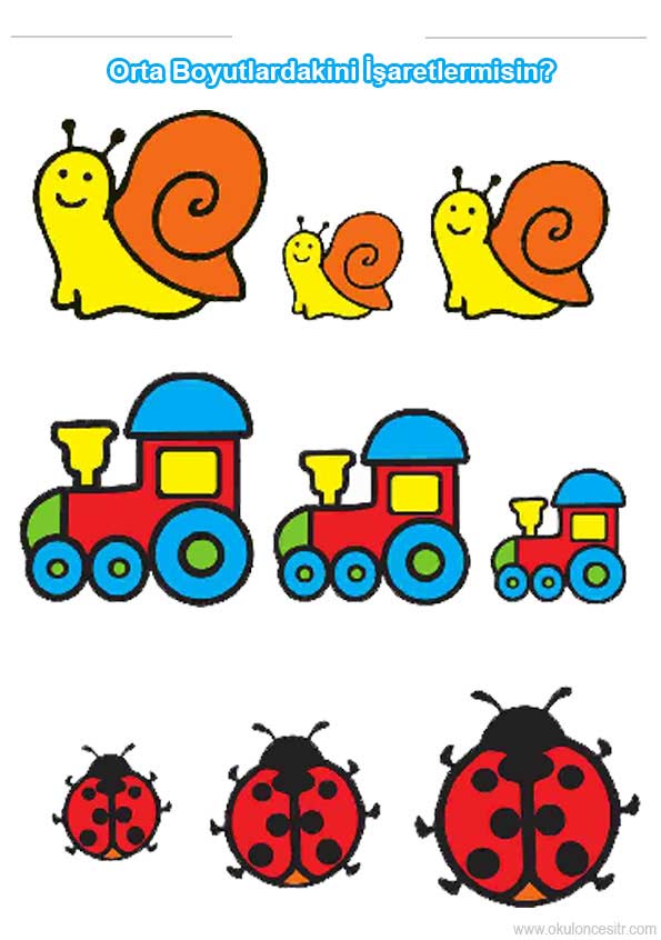 Büyük küçük kavramı çalışmaları renkli sayfası etkinlikleri ve tren, salyangoz, uğur böceği büyük küçük boyut kavramları oyunu örnekleri kağıdı indirme ve çıktı al yazdırma. Free big and small worksheets download printable.
