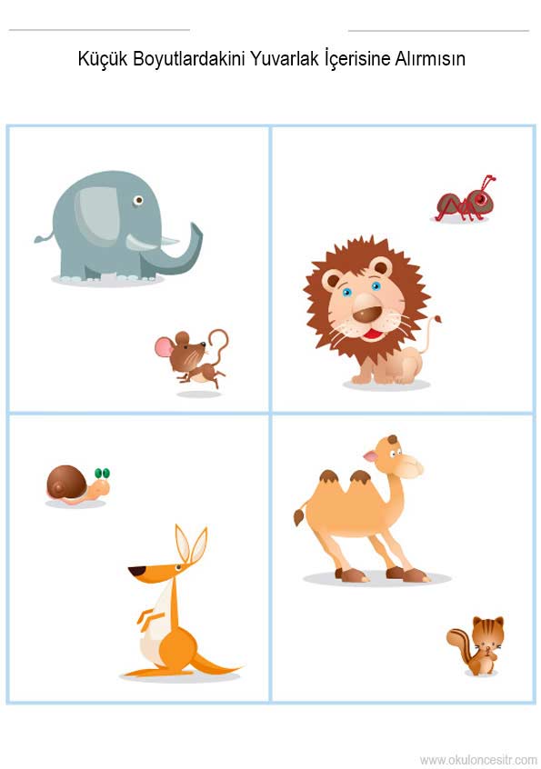 Büyük küçük kavramı çalışmaları renkli sayfası etkinlikleri ve hayvanlar aslan, deve, fil büyük küçük boyut kavramları oyunu örnekleri kağıdı indirme ve çıktı al yazdırma. Free big and small worksheets download printable.