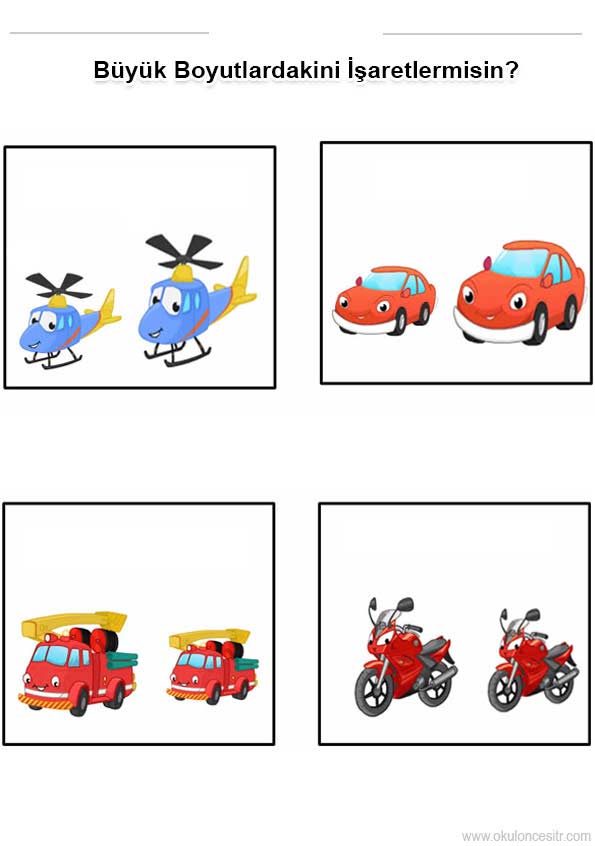 Büyük küçük kavramı çalışmaları renkli sayfası etkinlikleri ve trafik haftası motorbisiklet, itfaiye aracı, helikopter büyük küçük boyut kavramları oyunu örnekleri kağıdı indirme ve çıktı al yazdırma. Free big and small worksheets download printable.
