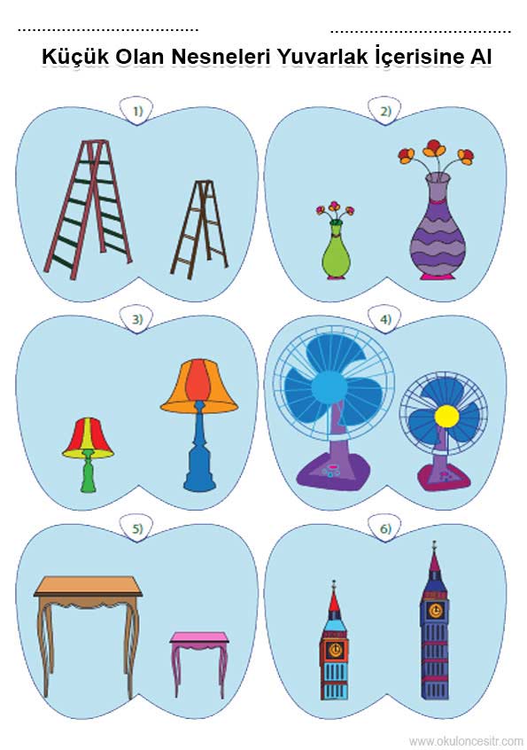 Büyük küçük kavramı çalışmaları renkli sayfası etkinlikleri ve vantilatör, masa, merdiven, saksıda çiçek büyük küçük boyut kavramları oyunu örnekleri kağıdı indirme ve çıktı al yazdırma. Free big and small worksheets download printable.