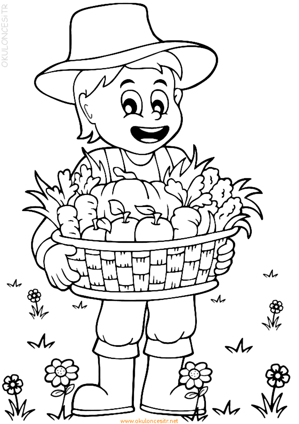 Okul öncesi, anasınıfı, ilkokul yerli malı haftası için çiftçi boyama sayfası, elinde meyve sebze sepeti tutan çiftçi boyamaları oyunu, yerli malı haftası etkinlikleri, yerli malı haftası panosu örnekleri, çalışmaları sayfası.