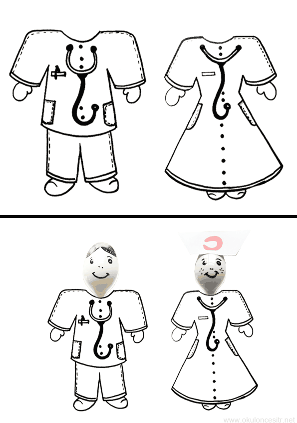 Okul öncesi anasınıfı ve ilkokul öğrencileri içim kızılay haftasında kullanılmak üzere hemşire ve doktor kalıbı. Kafa yapıları hayal gücünüze kalmakla birlikte plastik kaşık kullanabilirsiniz.