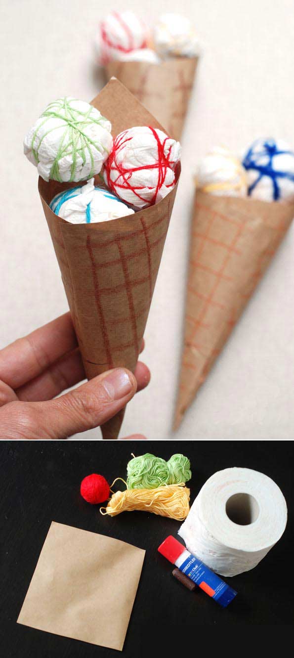 Tuvalet kağıdından ve renkli iplerden basit ve kolay şirin dondurma yapımı etkinlikleri çalışması ve örnekleri yapımı web sitesi sayfası.