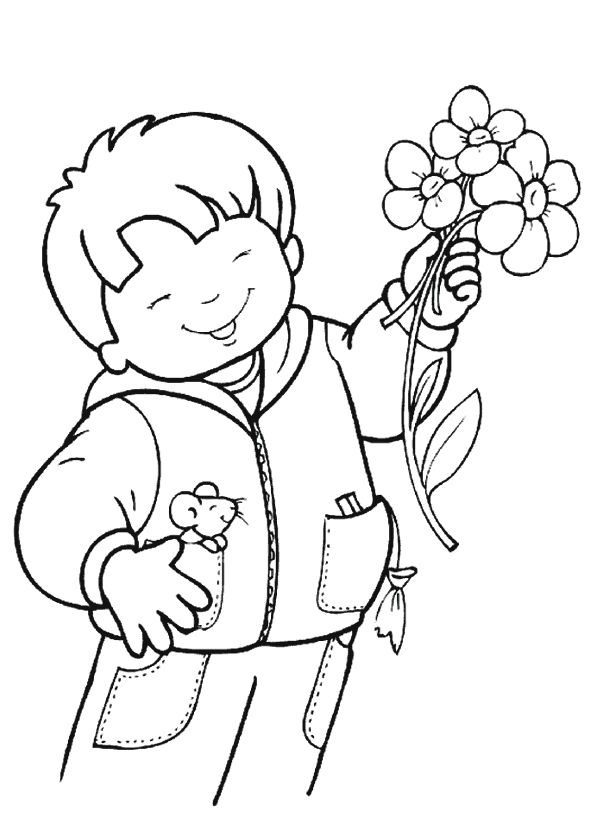 Elinde çiçek olan erkek çocuk boyama sayfası ile resmi boyamaları sayfaları bilgisayara indir ve çıktı al, yazdır. Free coloring pages download and printable.