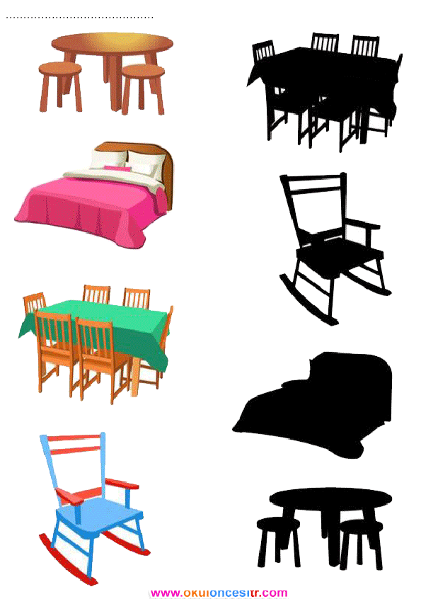 Gölge eşleştirme çalışma sayfası ve masa, sallanan koltuk, yatak ücretsiz eşleştirme etkinlikleri çalışma sayfaları kağıtları ile kağıtları indirme, yazdır. Free shadow matching worksheets download and printables.