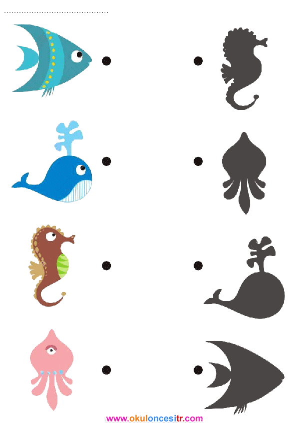 Gölge eşleştirme çalışma sayfası ve deniz canlıları, denizatı, ahtapot, balık ücretsiz eşleştirme etkinlikleri çalışma sayfaları kağıtları ile kağıtları indirme, yazdır. Free shadow matching worksheets download and printables.