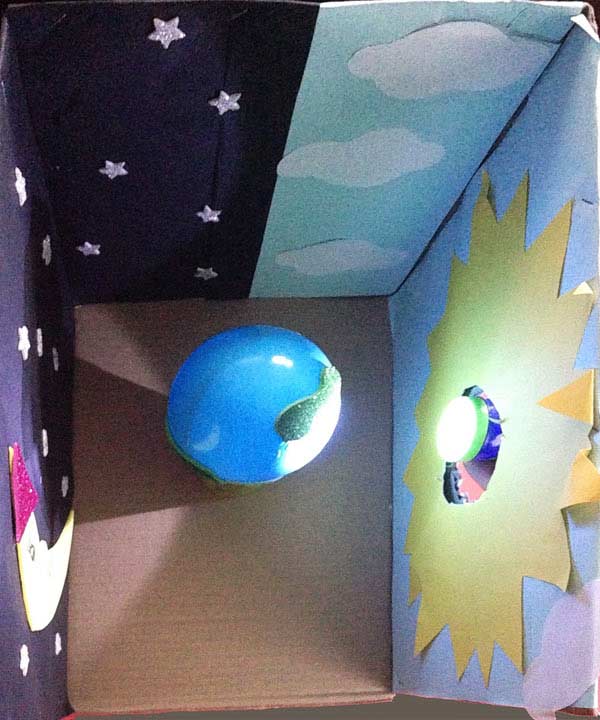 Okul öncesi anasınıfı güneş sistemi, uzay, gökyüzü üç boyutlu, gün ışığı ve karanlık oluşumu deneyidir.