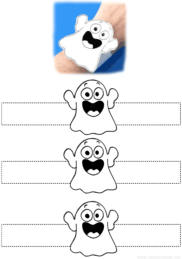 Okul öncesi anasınıfı etkinliklerinde kullanılmak üzere hayalet bileklik kalıbı, bileklik kalıbı indir, yazdır. Ghost wristband pattern.