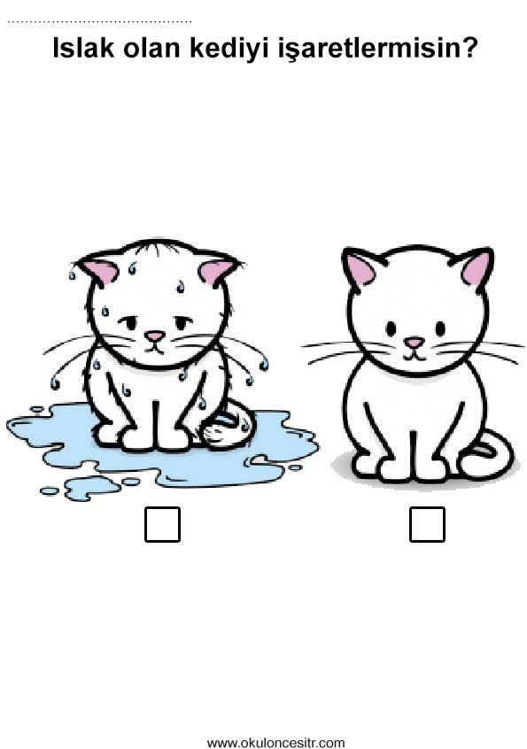 Islak kuru kavramı çalışma sayfası etkinlikleri ve yağmur kedi ıslak kuru duyu kavramları çalışmaları etkinliği örnekleri kağıdı indirme, çıktı yazdırma. Free wet dry worksheets download printable.