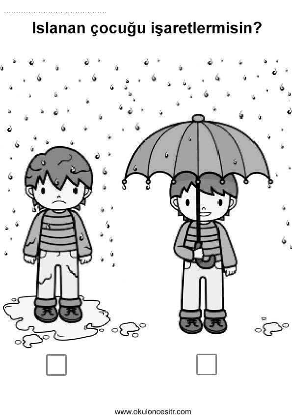 Islak kuru kavramı çalışma sayfası etkinlikleri ve şemsiye yağmur ıslak kuru duyu kavramları çalışmaları etkinliği örnekleri kağıdı indirme, çıktı yazdırma. Free wet dry worksheets download printable.