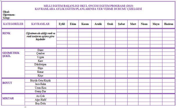 Kavramlara Aylık Eğitim Planlarında Yer Verme Çizelgesi