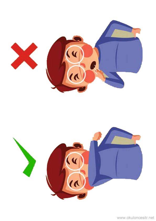 Korona ile ilgili hapşururken ve öksürürken doğru ve yanlışı gösteren bir resim.