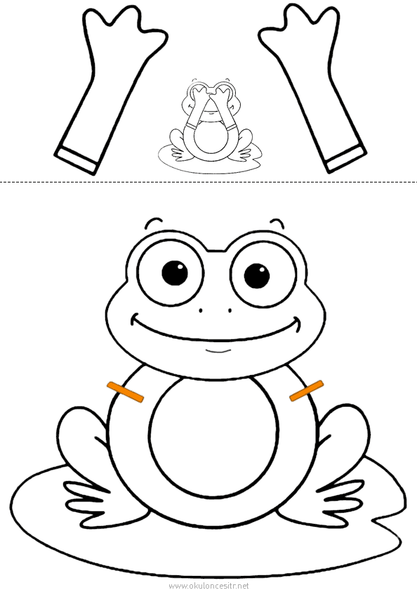 Okul öncesi anasınıfı kurbağa kalıbı etkinliğini resmi yazdır butonuna basarak çıkartabilirsiniz. Kalıbın çıktısını alın, daha sonra çizgilerle belirtilmiş yerden kağıdı kesin. Ellerin çevresini güzelce makasla kestikten sonra elleri kurbağanın turuncu renkli yerlerine yapıştırıcı sürerek yapıştırın. Önerilerinize göre değişiklikler yapabiliriz.