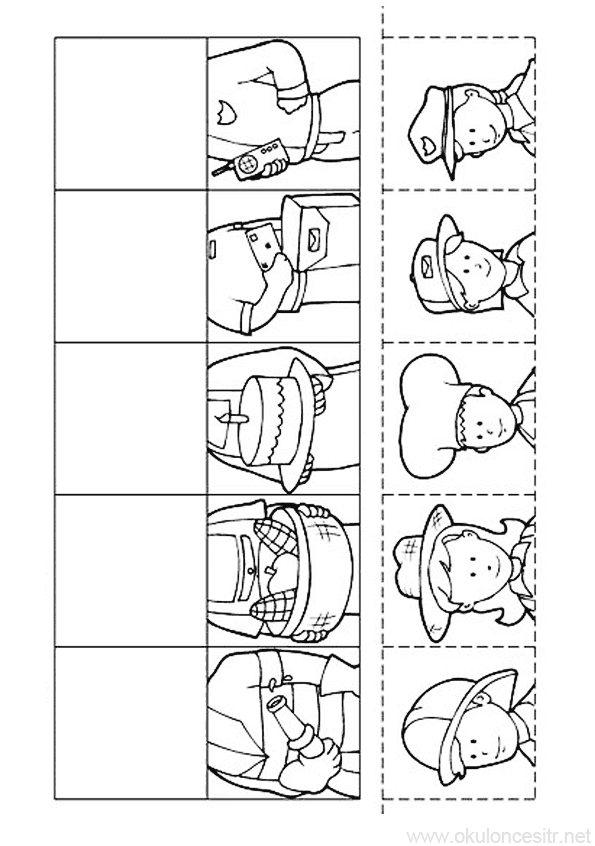 Meslekler eşleştirme çalışma kağıdı ve pastacı, çiftçi, itfaiyeci, trafik polisi ücretsiz eşleştirme etkinlikleri puzzle, eşleştirme çalışmaları, eşleştirme oyunları çalışma sayfaları kağıtları ile oyunları indirme, yazdır. Free matching worksheets download and printables.