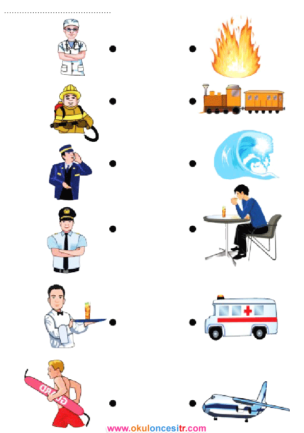 Meslekler eşleştirme çalışma kağıdı ve meslekler polis, doktor, itfaiyeci, ambulans şoförü ücretsiz eşleştirme etkinlikleri çalışma sayfaları kağıtları ile oyunları indirme, yazdır. Free matching worksheets download and printables.