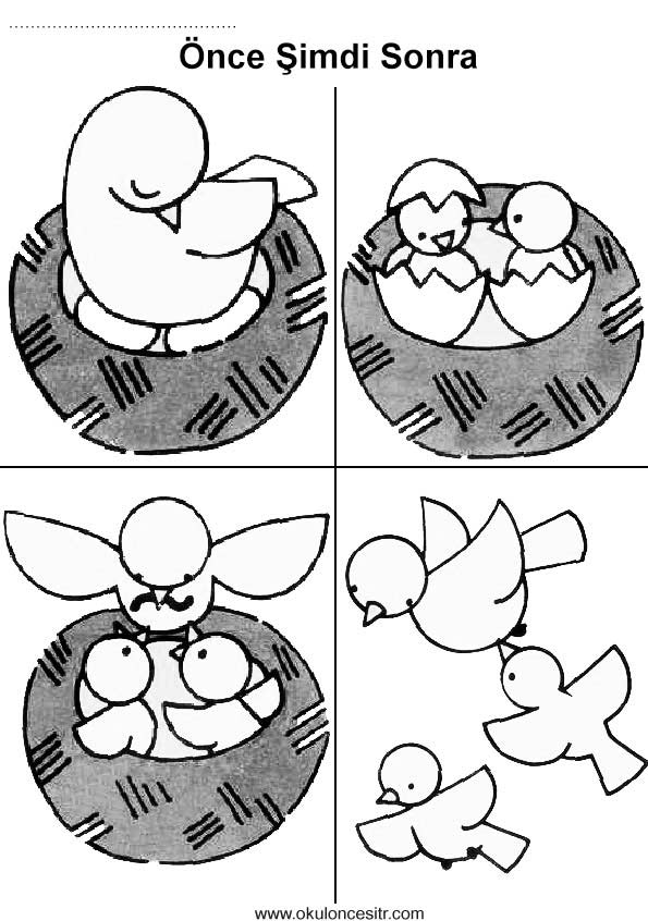 Önce şimdi sonra kavramı çalışma sayfası etkinlikleri ve kuş yuvası önce şimdi sonra zaman kavramları çalışmaları etkinliği örnekleri kağıdı indirme, çıktı yazdırma. Free before and after time worksheets download printable.