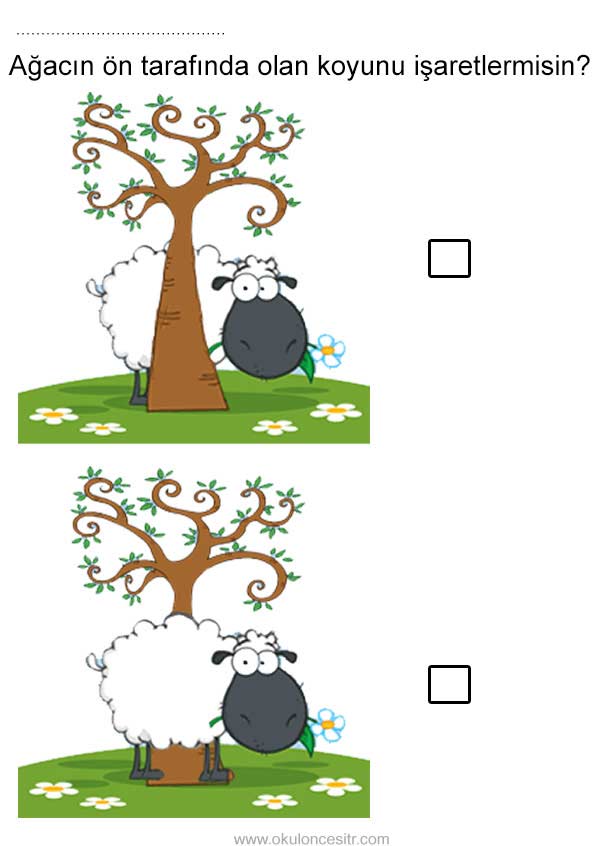 Önünde arkasında kavramı çalışma sayfası etkinlikleri ile kuzu koyun önünde arkasında mekanda konum kavramları çalışmaları etkinliği örnekleri kağıdı indirme, çıktı yazdırma. Free in front of and behind worksheets download printable.
