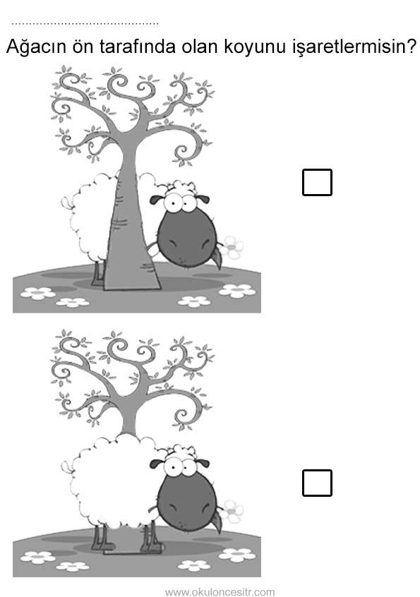 Önünde arkasında kavramı çalışma sayfası etkinlikleri ile kuzu koyun önünde arkasında mekanda konum kavramları çalışmaları etkinliği örnekleri kağıdı indirme, çıktı yazdırma. Free in front of and behind worksheets download printable.
