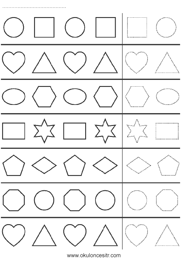 Örüntü çalışma sayfası kağıtları ile geometrik şekiller kalp, üçgen, kare, dikdörtgen örüntü sıralama etkinlikleri sayfaları yazdırma çıktı alma sitesi. Free pattern sorting worksheets download printtables.