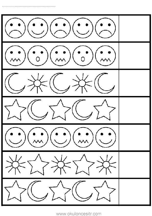 Örüntü çalışma sayfası kağıtları ile yüz ifadeleri örüntü sıralama etkinlikleri sayfaları yazdırma çıktı alma sitesi. Free pattern sorting worksheets download printable.
