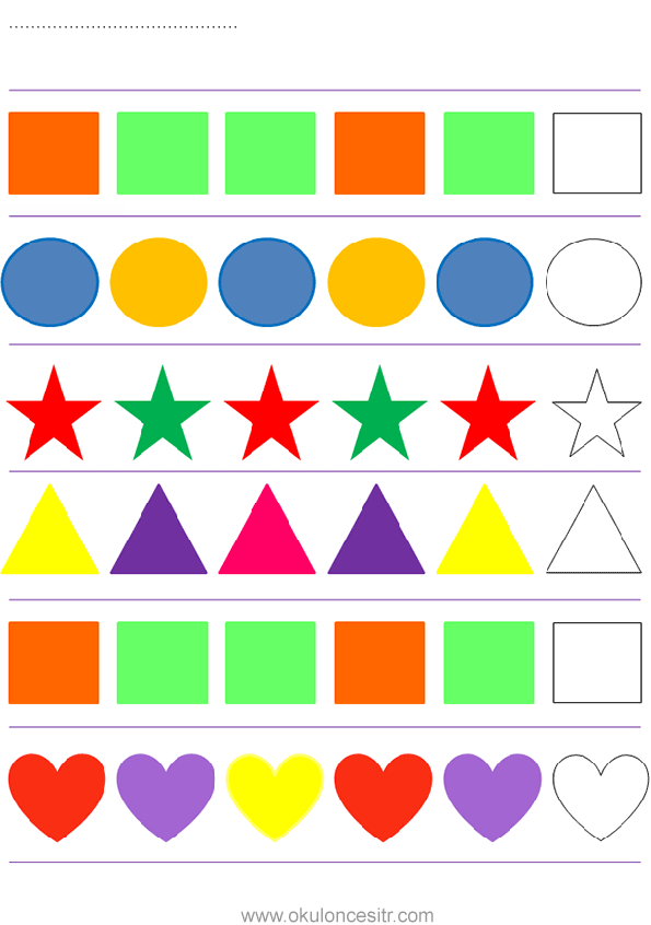 Örüntü çalışma sayfası kağıtları ile geometrik şekiller yıldız, kalp, kare örüntü sıralama etkinlikleri sayfaları yazdırma çıktı alma sitesi. Free pattern sorting worksheets download printable.