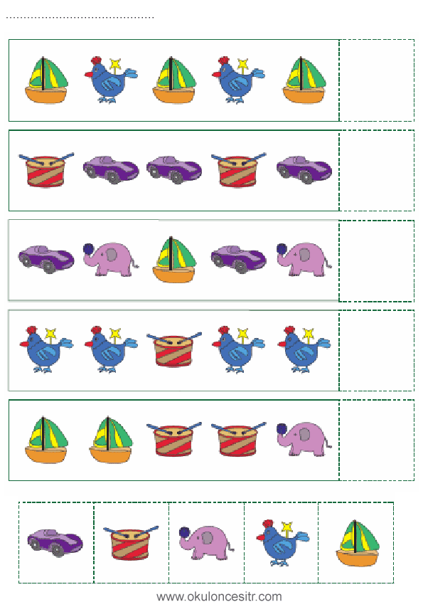 Örüntü çalışma sayfası kağıtları ile örüntü sıralama etkinlikleri sayfaları yazdırma çıktı alma sitesi. Free pattern sorting worksheets download printable.