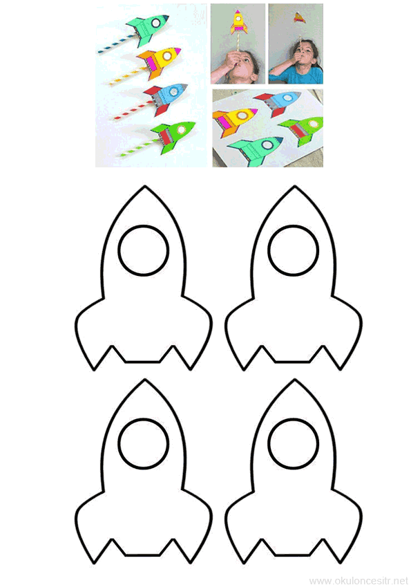 Okul öncesi anasınıfı etkinliklerinde kullanılmak üzere roket kalıbı, kalıbın altına pipet ekleyerek üfleyince uçan roket kalıbı indir yazdır, pdf çıktı al sitesi.