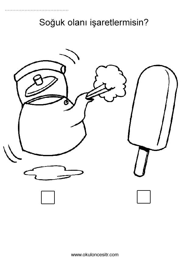 Sıcak soğuk kavramı çalışma sayfası etkinlikleri ve çaydanlık, dondurma sıcak soğuk duyu kavramları çalışmaları etkinliği örnekleri kağıdı indirme, çıktı yazdırma. Free hot cold worksheets download printable.
