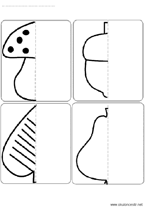 Simetri tamamlama etkinlikleri çalışması ve mantar armut resimli simetri eşleştirme çalışma kağıtlarını bilgisayarınıza indirip yazıcıdan yazdırabilirsiniz. Free symmetry worksheet printables.