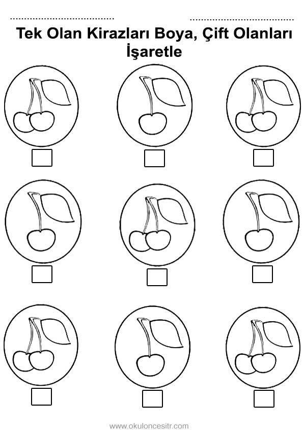 Tek çift kavramı çalışma sayfası ve vişne tek çift miktar kavramları çalışmaları oyunu, etkinliği örnekleri kağıdı indirme ve çıktı yazdırma. Free more or less worksheets download printable.