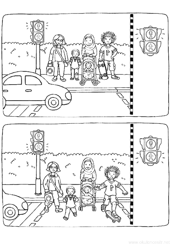 Okul öncesi anasınıfı trafik haftası etkinliklerinde kullanılmak üzere trafik lambası, trafik ışığı, yaya geçidinden geçen çocuklar, aile, yol verme boyama sayfası, kalıbı çalışmaları, örnekleri, yazdır, çıktı al indir.